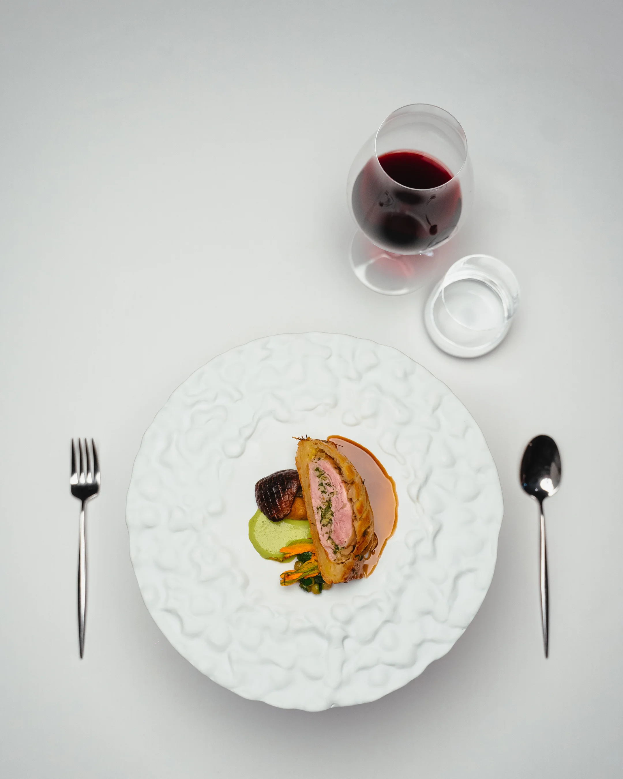 Moro, riccio, abbronzato con un taglio moresco degli occhi che sembra sottolineato da un tocco vezzoso di matita: Alessandro è un ragazzo anche se di anni ne ha ormai trentatré. La fisiognomica tradisce una gioventù maggiore dell’età anagrafica e della maturità di pensiero che guidano un imprenditore ristoratore affascinato dall’estremo mito della bellezza. È una bellezza di pensiero prima di tutto che non si ferma alla purezza astratta delle idee, che sono visioni, e che anticipano i teoremi della cucina di Sapio, ma che si traduce nella concretezza tutta materiale del gesto con cui Alessandro manipola, plasmando, la materia e con cui gli architetti di Sapio hanno modellato gli spazi integrando legno, pietra, acqua, fuoco trasformando materie ancestrali in materiali da costruzione della casa che ci ospita, tracciando percorsi di senso paralleli e multimodali. A partire dagli spazi di Sapio, quelli fisici e abitabili, che accolgono la brigata per le lavorazioni in una cucina transatlantico che ricorda il Rex, e che ricevono gli ospiti in un salone ampio, e quelli metafisici, di pensiero, aperti-chiusi, proiettati verso o introversi, che giocano con una materia corporea molto tattile, porosa e minerale, ora ruvida ora liscia creando epicentri di luce in corrispondenza dei tavoli che emergono dal grigionero etneo, neutro ma non neutrale nel dare dimensione agli spazi, dove il colore risalta. Sono prospettive e volumi che assicurano comfort e una pace interiore secondo iconici concept di ospitalità in base ai quali ‘il ristorante ospita, il cortile accoglie, la cantina intrattiene, le camere abbracciano’. Opere selezionate di artisti locali dialogano con il contesto senza sovraccaricarlo, contribuendo alla definizione di un luogo che, pur essendo un ristorante, assume il carattere di uno spazio culturale.