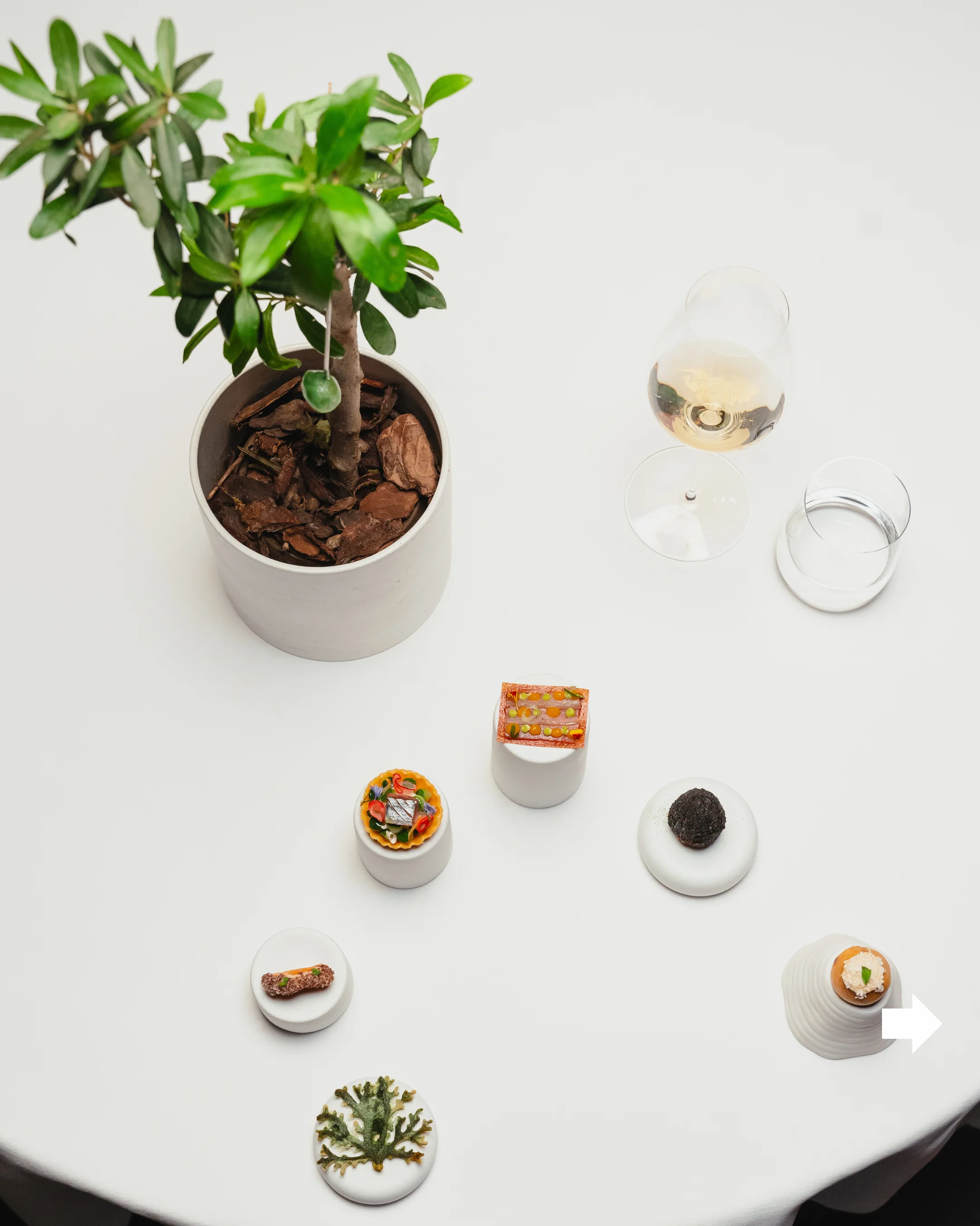 Scelgo il menù Sapere Sapore che potremmo chiamare Sapio perché esprime le due teste, di gusto e di conoscenza, della cucina di Ingiulla. Il benvenuto inizia con una foglia di polvere di alghe essiccate a forma di corallo con maionese di ricci di mare e gel di limone; olive con foie gras e pistacchio in guscio di burro di cacao appese a un grazioso alberello d’ulivo trionfale in tavola con il suo vasetto lucido; sarda a beccafico fritta con una maionese al prezzemolo; la chips di maiale ripiena di Nero dei Nebrodi che disegna un suinetto bruno stilizzato nella forma. Poi fa bella mostra un arancino in crosta al nero di seppia con mozzarella, zafferano e una genovese di alalunga che sembra ricoperta di polveri dell’Etna. Infine ecco un macaron con erborinato di capra e gel di wasabi.